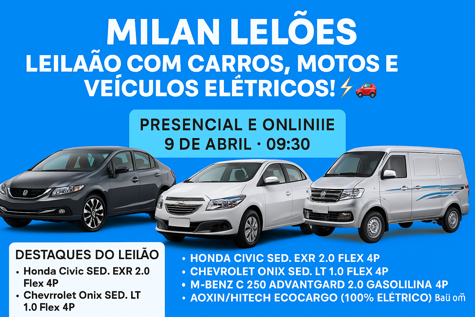 A Milan Leilões realizará um leilão de veículos – incluindo carros, motos, caminhões e caminhonetes – nesta quarta-feira (02 de abril). A visitação presencial ocorrerá…